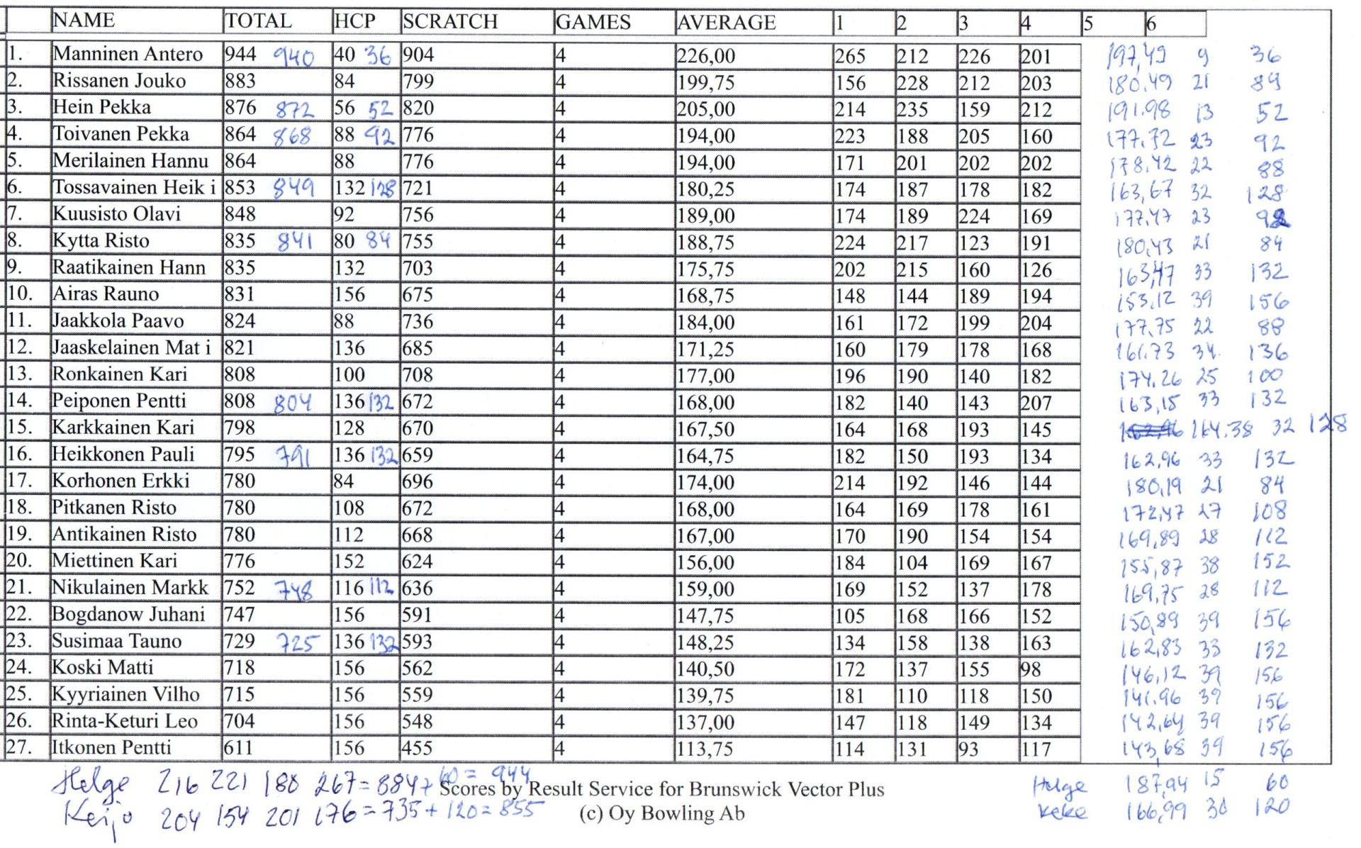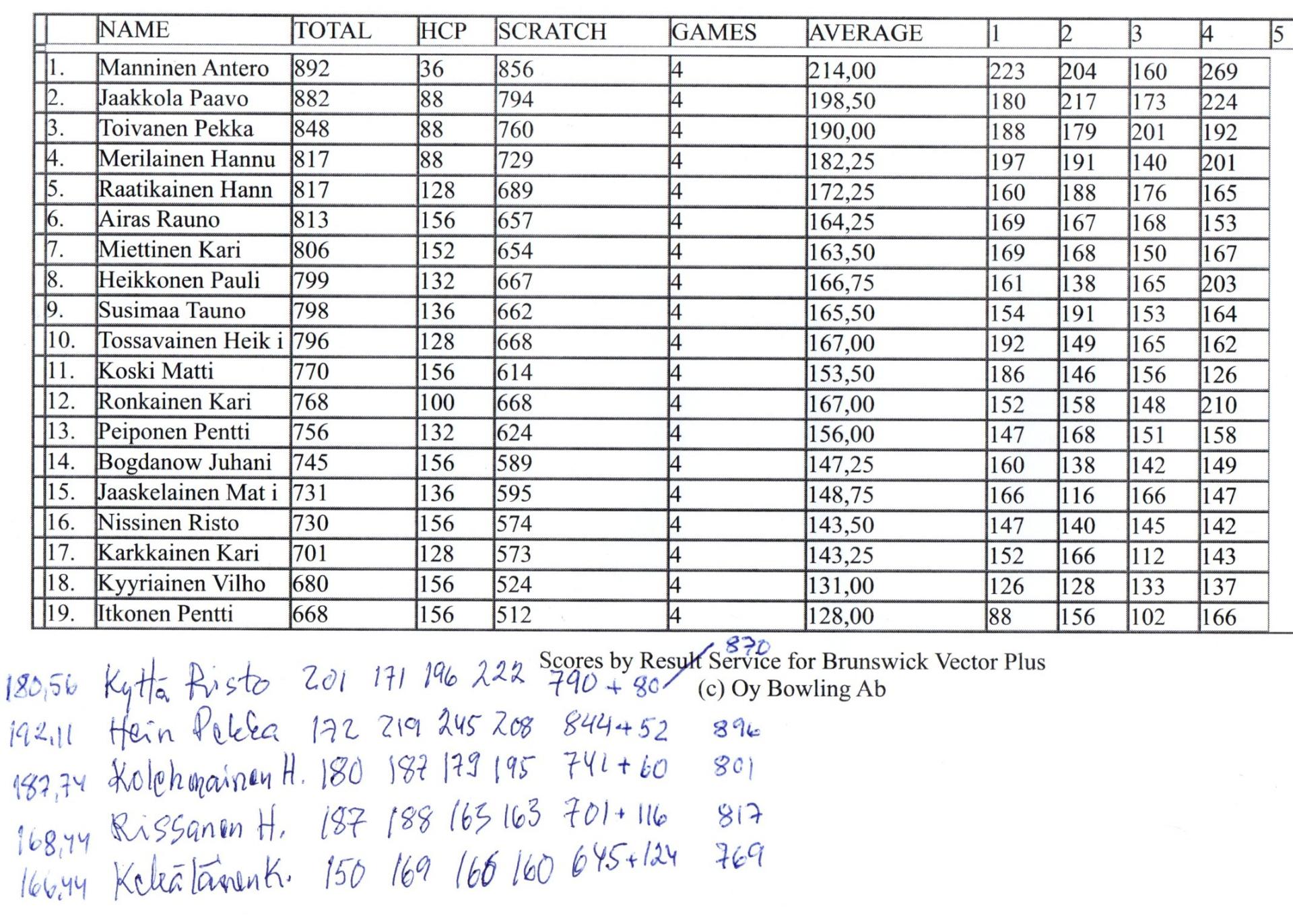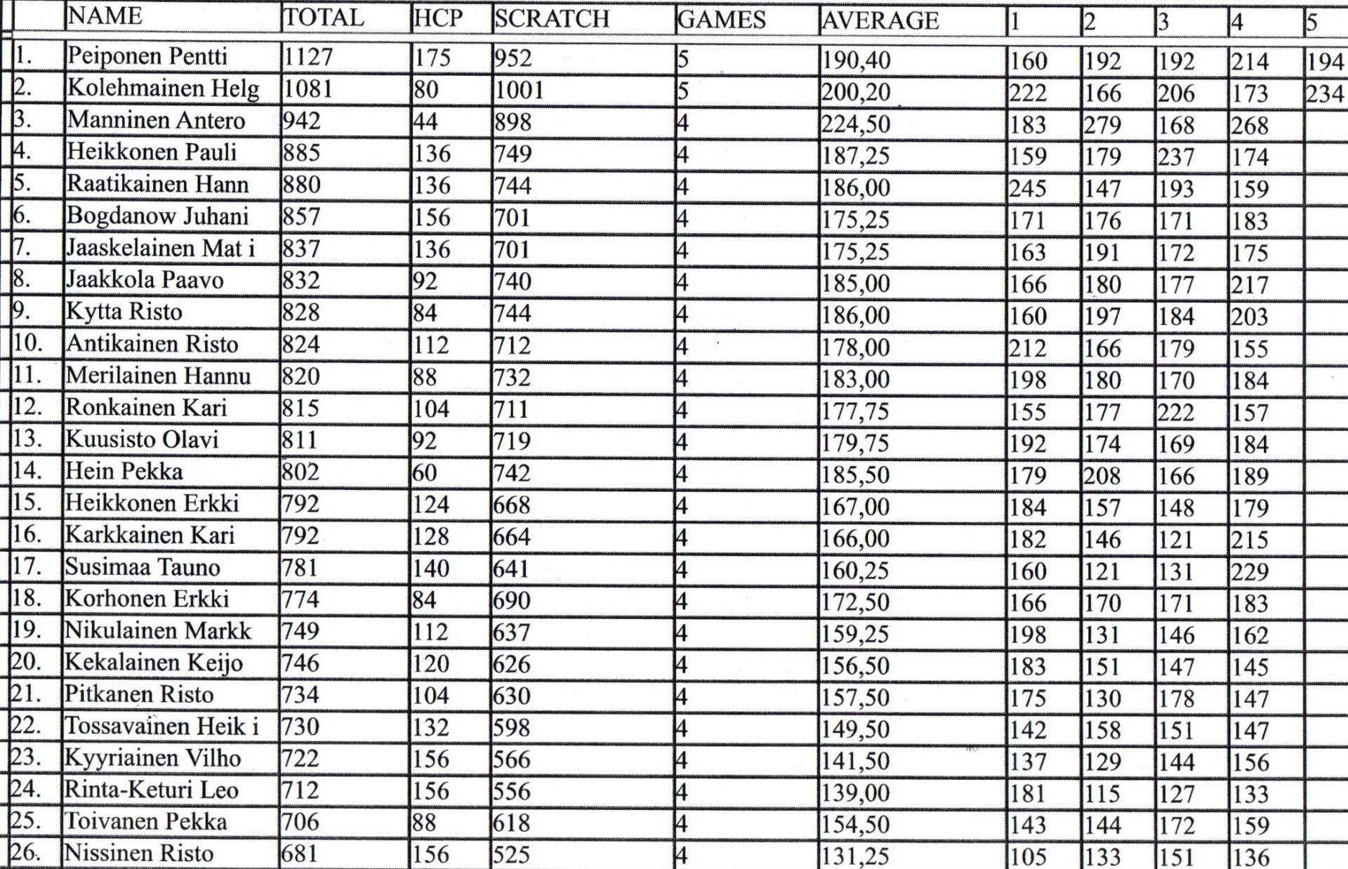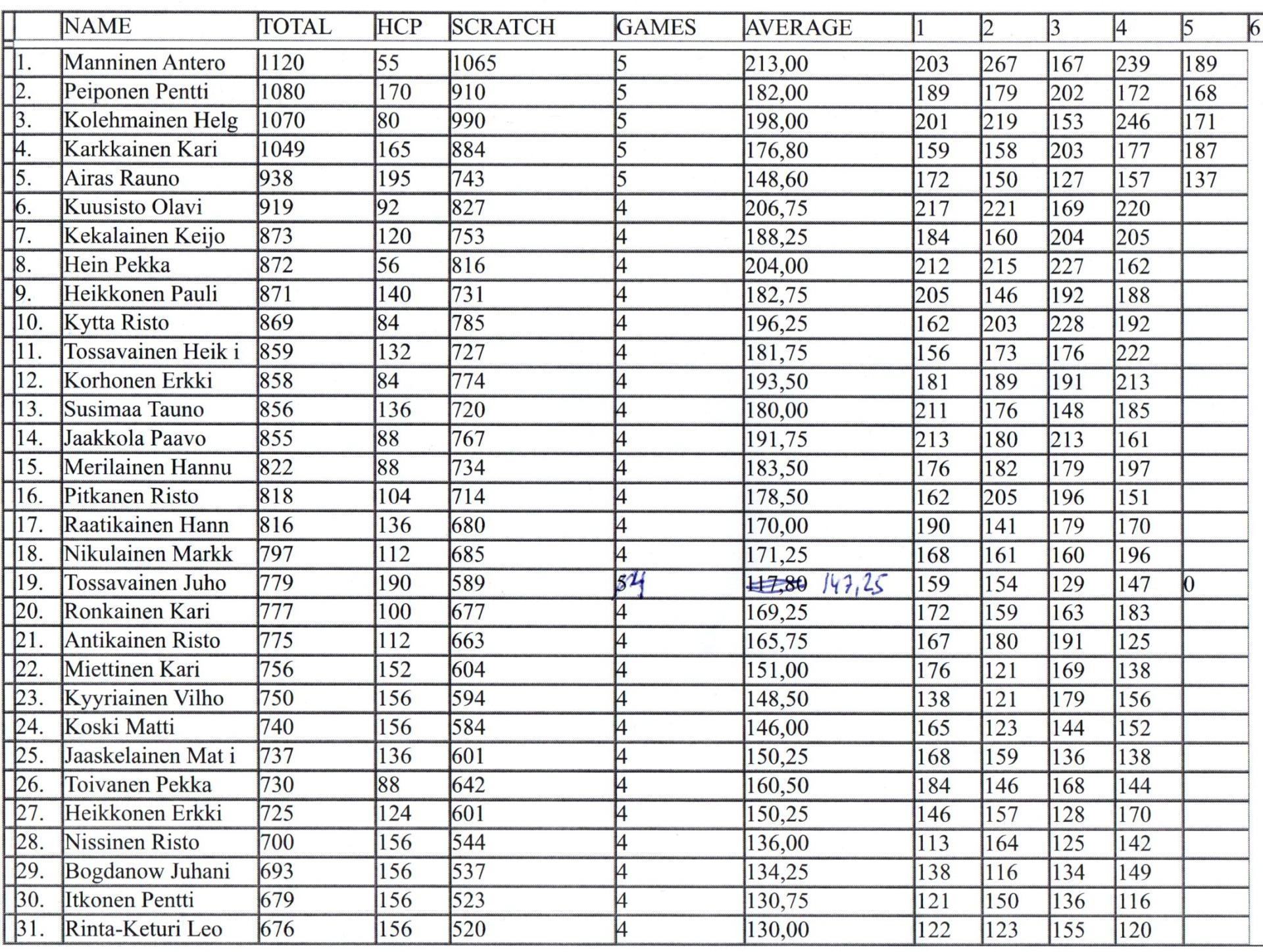 | 16 | Heikkonen Pauli | 6 | 700 | 885 | 871 | 799 | 795 | 4050 | 720 | |