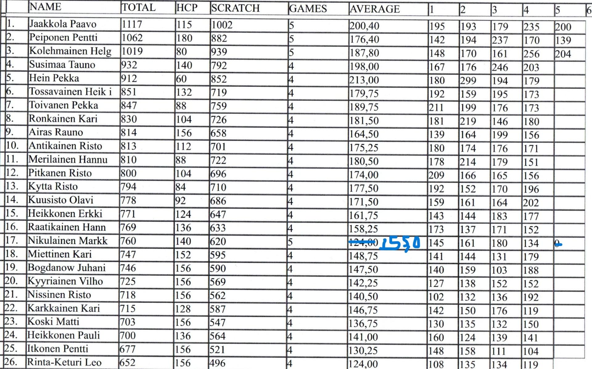 | 17 | Nikulainen Markku | 1 | 760 |