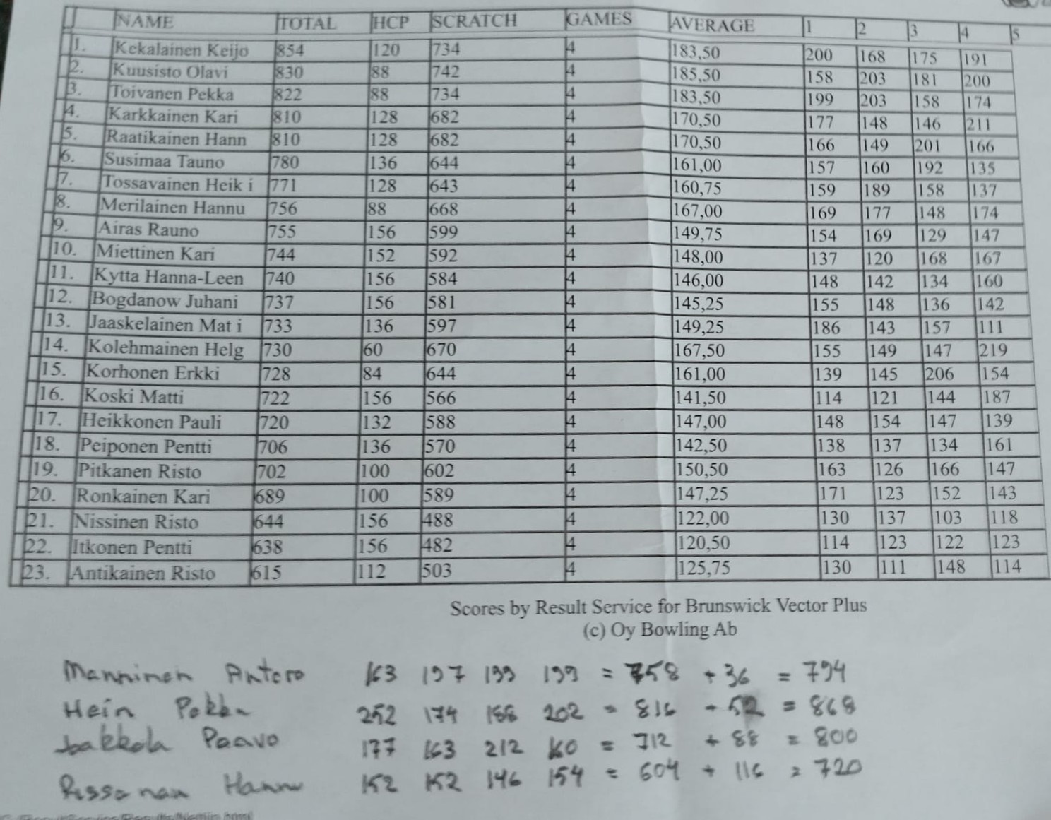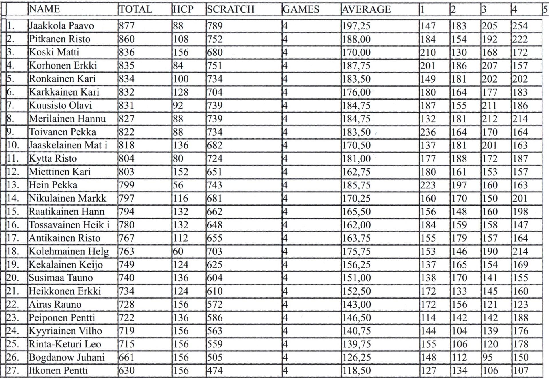 | 16 | Heikkonen Pauli | 6 | 700 | 885 | 871 | 799 | 795 | 4050 | 720 | |