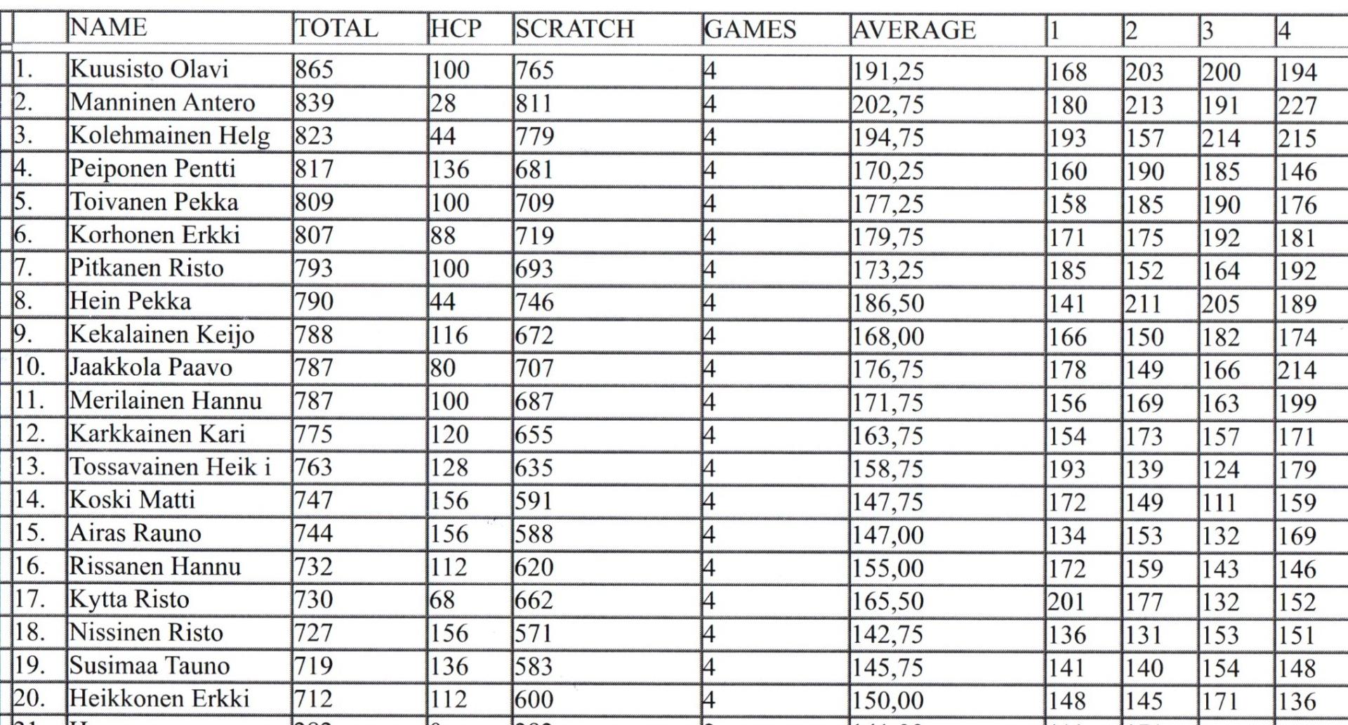 16 | Korhonen Erkki | 4 | 829 | 807 | 771 | 846 | 3253 | |