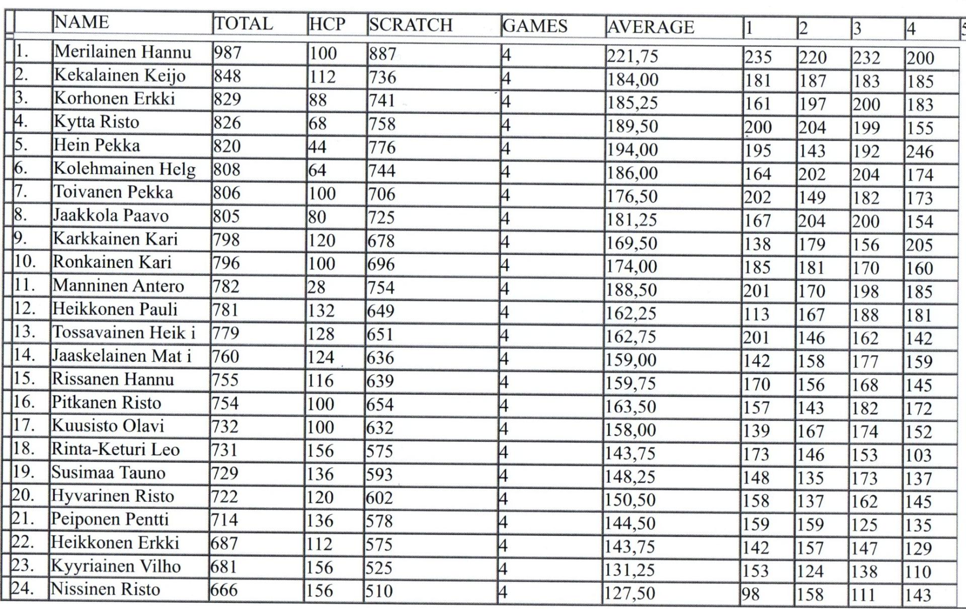 24 | Heikkonen Erkki | 4 | 687 | 712 | 751 | 712 | 2862 | |